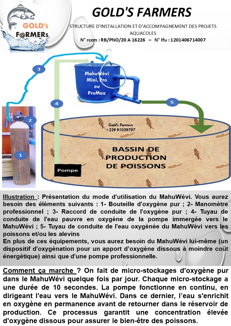 The MahuWévi is an advanced oxygenation system designed to improve water quality in aquaculture ponds. It operates through micro-injections of pure oxygen delivered several times a day, with each injection lasting 5 to 10 seconds. A pump maintains a continuous water flow to the MahuWévi, where the water becomes enriched with oxygen before being redirected to the pond. This process ensures a high concentration of dissolved oxygen essential for fish health. The device is available in several models: Mini, Pro, and ProMax, with both standard and customized options.